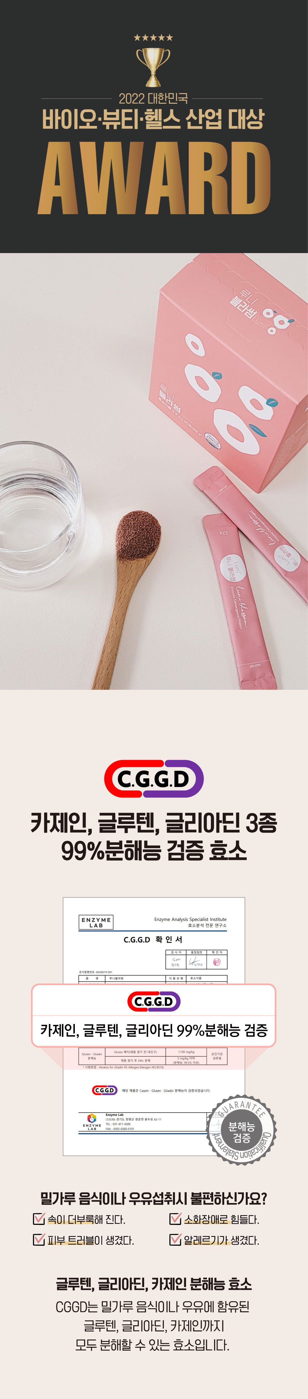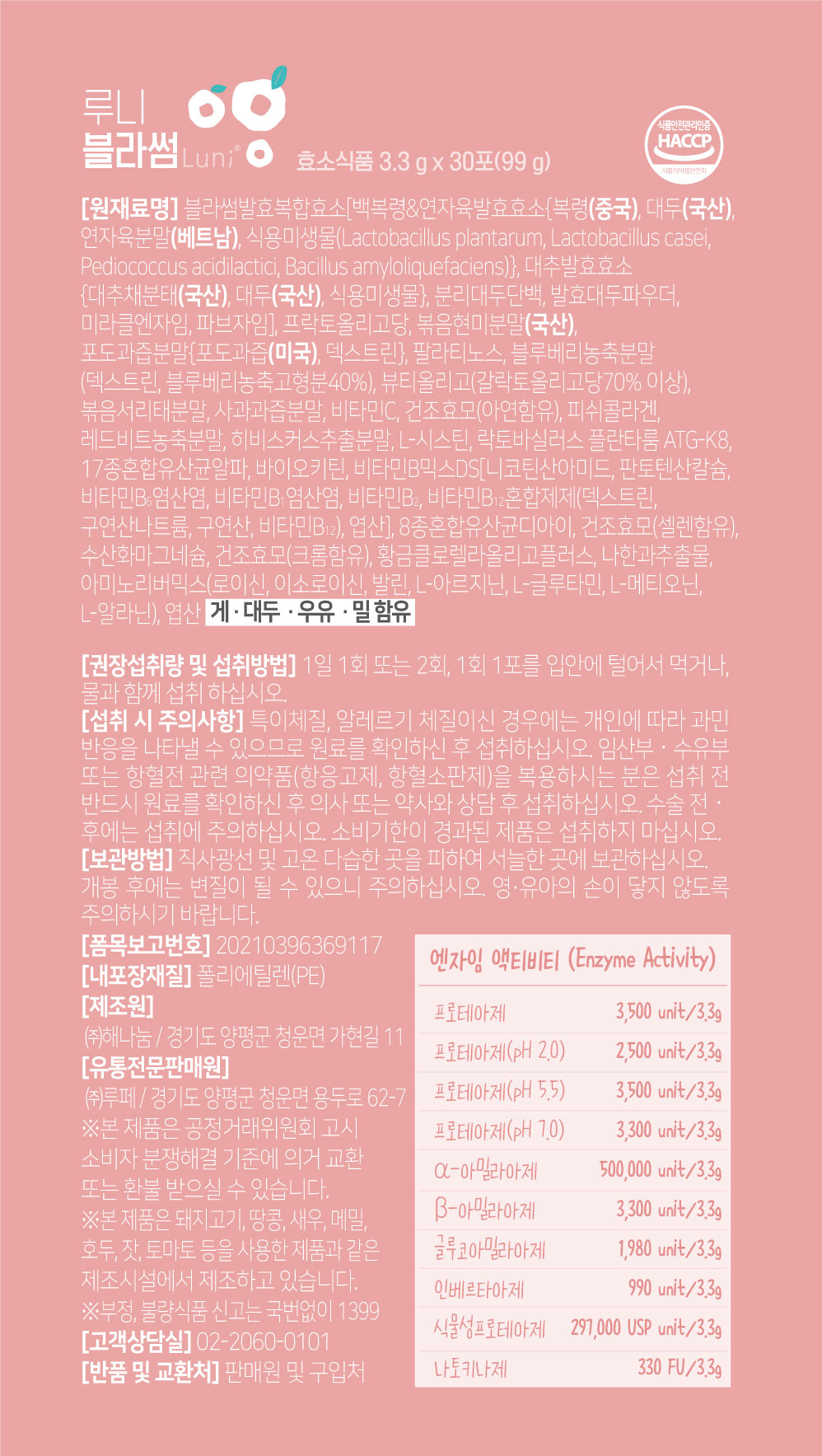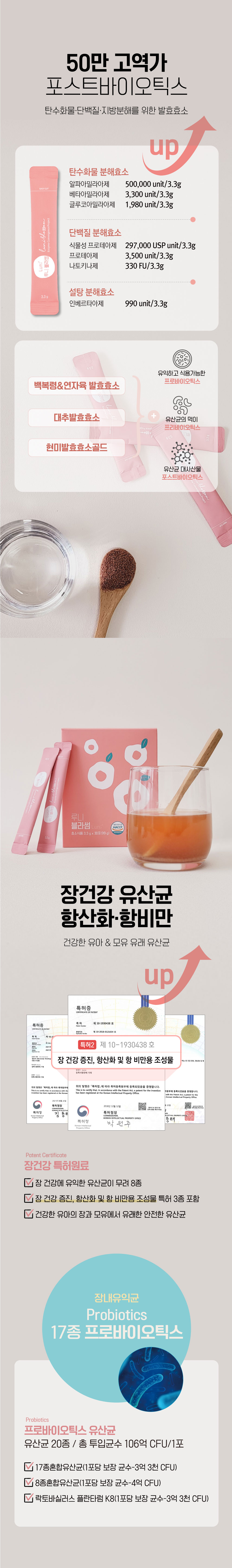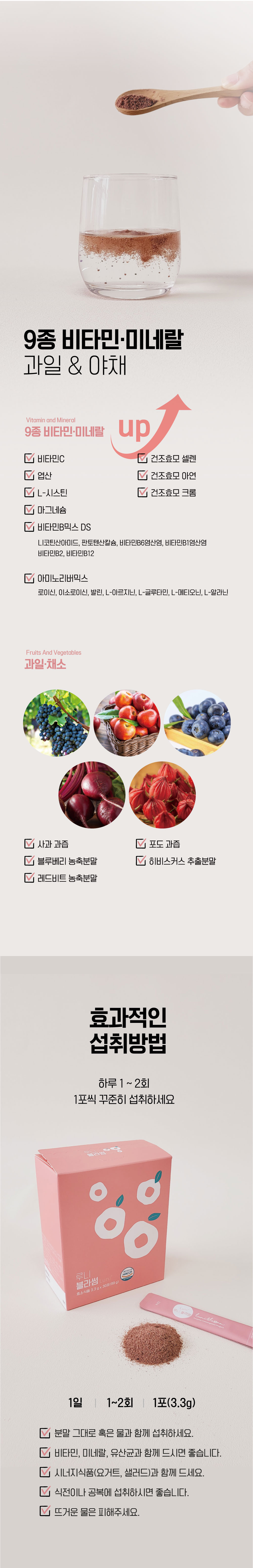 2. Thành phần: Bột phức hợp lên men blossom {Enzyme lên men từ nấm Phục Linh và hạt sen [Phục linh, đậu tương, bột hạt sen, vi sinh vật ăn được (Lactobacillus plantarum, Lactobacillus casei, Pediococcus acidilactici, .. ], protein đậu tương, bột đậu tương lên men, Miracle enzyme [Bột lên men từ gạo lứt; Bột lên men Natto; Biocore Optimum K (Bột lên men Aspergillus oryzae; Bột lên men Aspergillus niger; Bột nuôi cấy men; Maltodextrin)], Fabzyme [Biocore Optimum K (Bột lên men Aspergillus oryzae; Bột lên men Aspergillus niger; Bột nuôi cấy men; Maltodextrin); Bột lên men Natto; Enzyme lên men từ dứa]}, Fructo-oligosaccharide, Bột gạo lứt rang, Bột nước ép nho [Nước ép nho, chất mang (dextrin)], chất tạo ngọt nhân tạo (palatinose), bột cô đặc việt quất [chất mang (dextrin), việt quất cô đặc 40%], Beauty oligo (galacto-oligosaccharide chiếm hơn 70%), bột đậu đen xanh lòng rang, bột nước ép táo, vitamin C, men khô (chứa kẽm), collagen cá, bột củ cải đỏ cô đặc, bột chiết xuất hoa dâm bụt, L-cystine, lactobatobacillus plantarum ATG-K8, 17 loại vi khuẩn axit lactic hỗn hợp (Lactobacillus acidophilus, Lactobacillus plantarum, Lactobacillus casei, ..., Chitin, hỗn hợp vitamin B [nicotinamide, Canxi Pantothenate, Vitamin B6 hydrochloride, Vitamin B1 hydrochloride, Vitamin B2, Hỗn hợp Vitamin B12 (Dextrin, natri citrat, axit citric, vitamin B12) Axit Folic], Hỗn hợp 8 vi khuẩn axit lactic Bacteria DI (Bifidobacterium animalis ssp. Lactis, Lactobacillus paracasei,...), Men khô (chứa Selen), chất điều chỉnh độ acid (Magnesium hydroxide), Men khô (Chứa Crôm), bột tảo vàng Chlorella, Chiết xuất quả La Hán, Bột hỗn hợp Axit Amino (Leucine, Isoleucine, Valine, L-Argine, L-Glutamine, L-Methionine, L-alanine), Axit Folic.